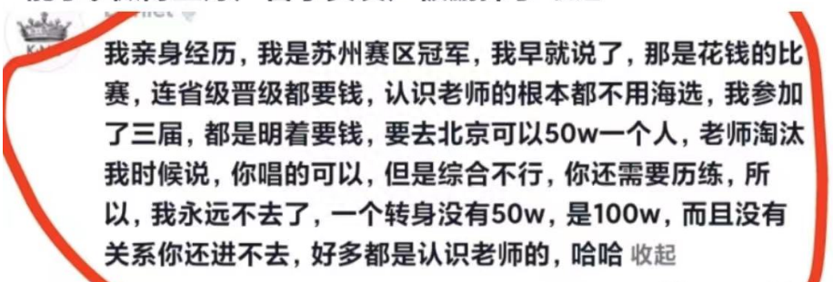 除了这位实习生之外,一位自称是好声音苏州赛区冠军的网友也现身发声,声称好声音的确是花钱晋级的比赛,连省级晋级都需要用钱铺路,认识老师的选手甚至可以不通过海选就直接通关,这位网友自曝自己曾参加过三届好声音,都被节目组明摆着要钱,要去北京可以,出价为50万,导师一个转身则为100万,没有关系的人根本无法入围。