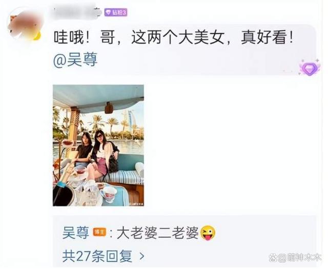 随后吴尊还在评论区积极跟网友互动,介绍美食和风景,其中有一位网友大赞吴尊老婆和女儿都是大美女,吴尊居然回复了一句 " 大老婆二老婆 "。