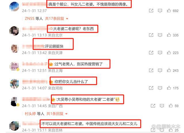 很快的,相关争议发酵,吴尊本人似乎意识到了不妥,目前已经删除了这条回复评论,但是他的微博评论区已经沦陷,大批网友怒斥他 " 把女儿当什么了 ",还有网友嘲讽怎么不叫儿子老公呢,看来吴尊这句话确实引发了不适和众怒。