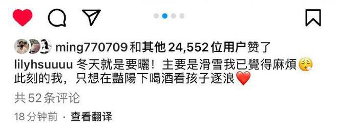 不过即便如此,依然挡不住小 S 爱炫耀的本性。这次小 S 便表示 " 冬天就是要晒,主要是滑雪我已觉得麻烦。此刻的我,只想在太阳下喝酒看孩子逐浪 "。
