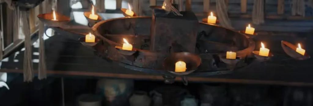 事实上,这个吊灯,只是拿马车轮、碗和蜡烛拼装而成的简易制品。