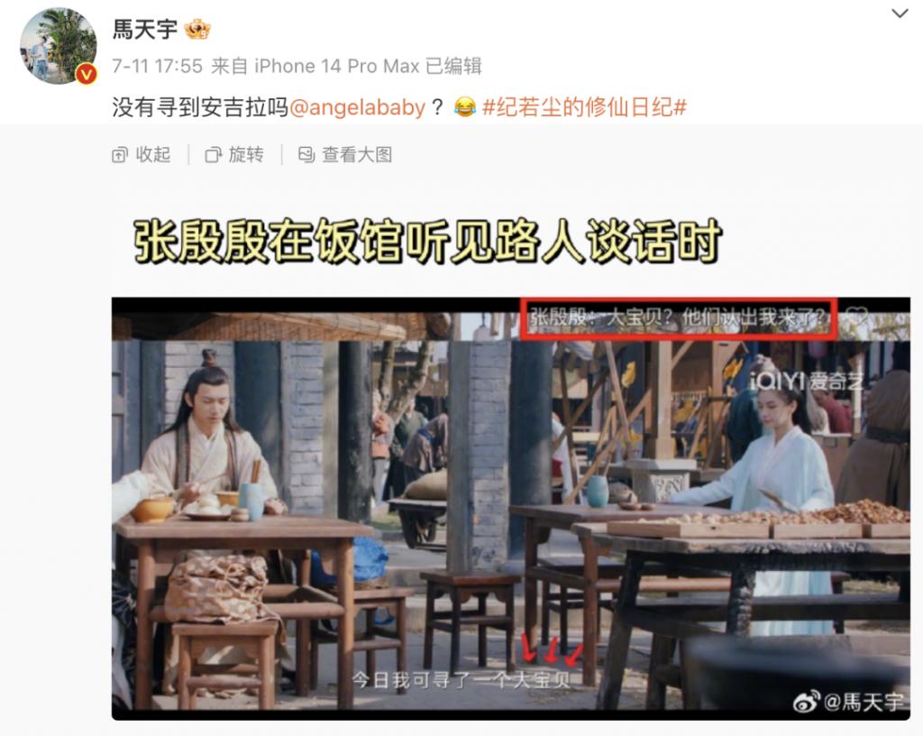 剧中女主张殷殷听路人说找到了个大宝贝,马天宇就立马截了弹幕艾特 Angelababy: