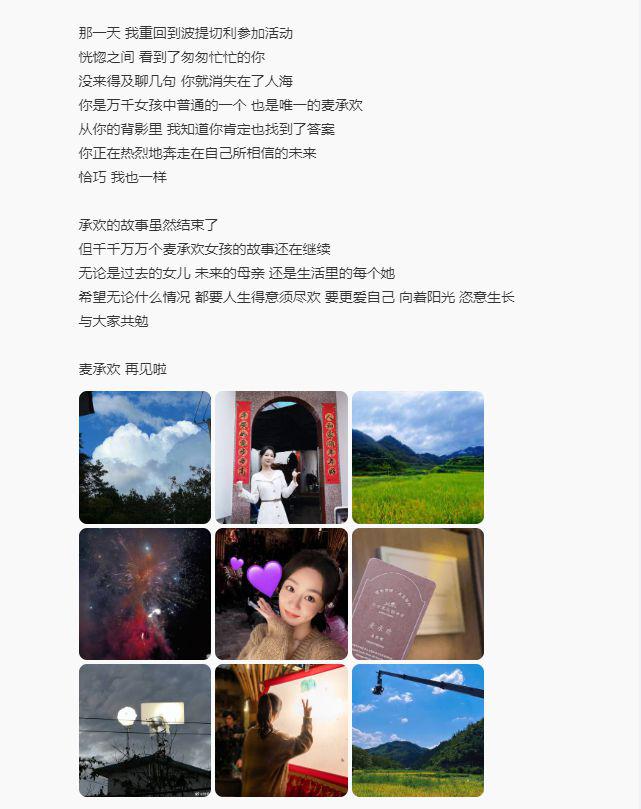 在该剧落下帷幕之际,杨紫也在个人的社交平台上发出了一片超长的作文,并且配上了九宫格的照片,来告别她饰演的 " 麦承欢 "。在她的文案中,也透露出了对麦承欢的 " 不满 ",以及对她的企盼,更是表达了对该角色的不舍了,这也让人依旧沉浸在剧情中无法自拔。
