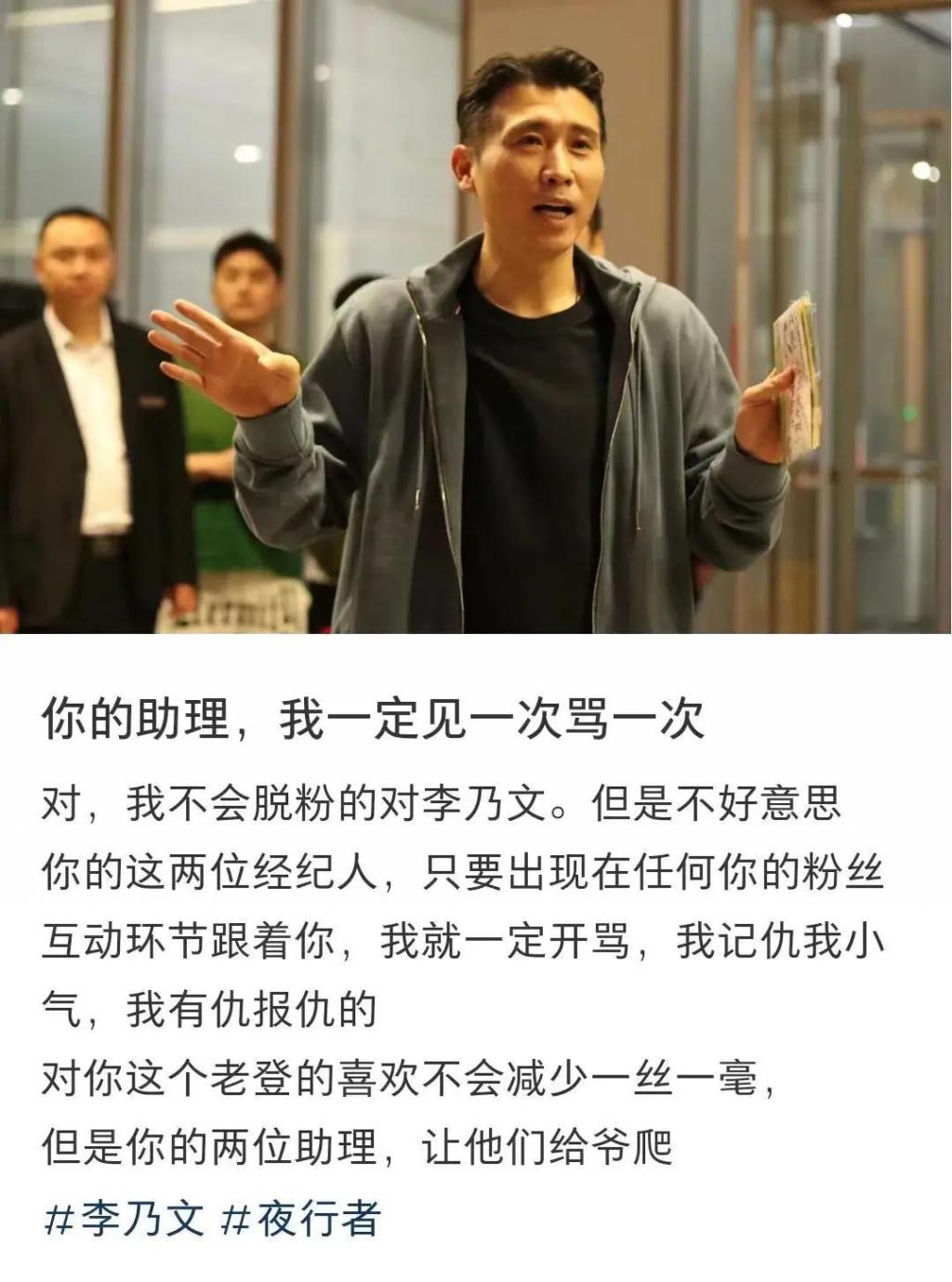 对于李乃文经纪人的做法,有粉丝评价说,李乃文没问题的,对粉丝也真的很好很友善。我看过他三次现场,但是他的两个助理真的很难评。