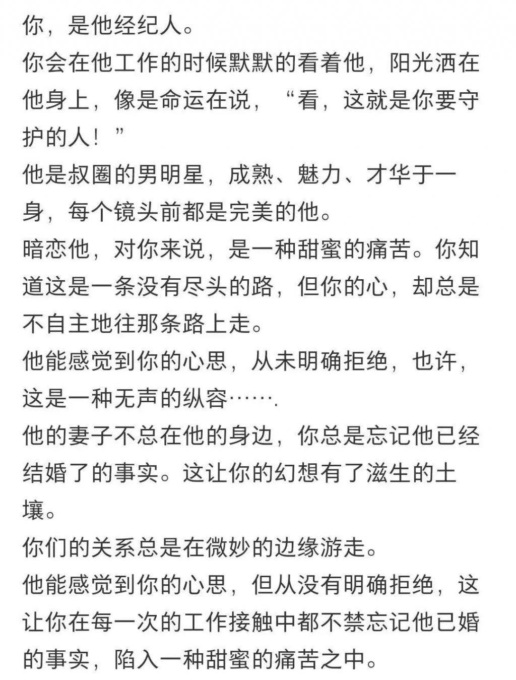 也有粉丝直接在网上开帖子,写起了了李乃文和女经纪人的梦女文学,把女经纪人写成暗恋自己老板的萌新蠢物,为了获得老板的关注,经常犯错,老板还要体谅大度包容自己的下属。
