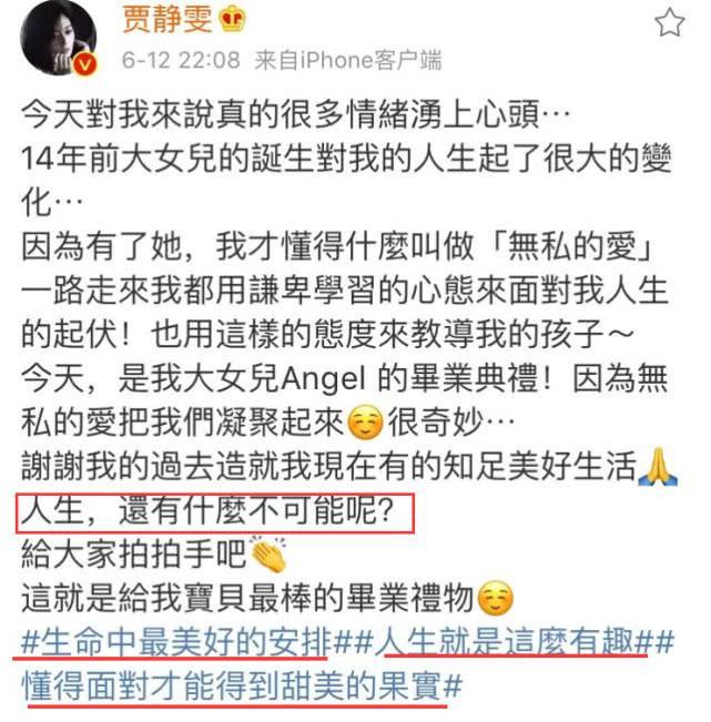 可见这也是她内心的最真实写照,而在文中有一段文字很让人感慨,谢谢我的过去造就我现在有的知足美好生活,“人生,还有什么不可能呢“?十个字也是让人泪奔,可见如今经的贾静雯,再也不是当年那个在媒体前痛哭流涕的她,经历了世事后,她变得坦然了,也更加的明媚了!