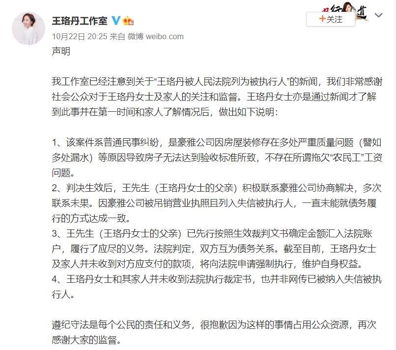 10月22日晚间,王珞丹工作室针对此事发布声明称,该案件系普通民事纠纷,是豪雅公司因房屋装修存在多处严重质量问题(譬如多处漏水)等原因导致房子无法达到验收标准所致,不存在所谓拖欠“农民工”工资问题。