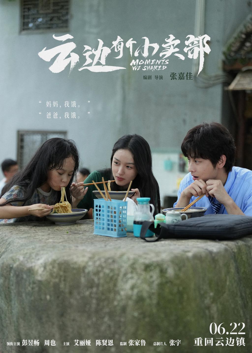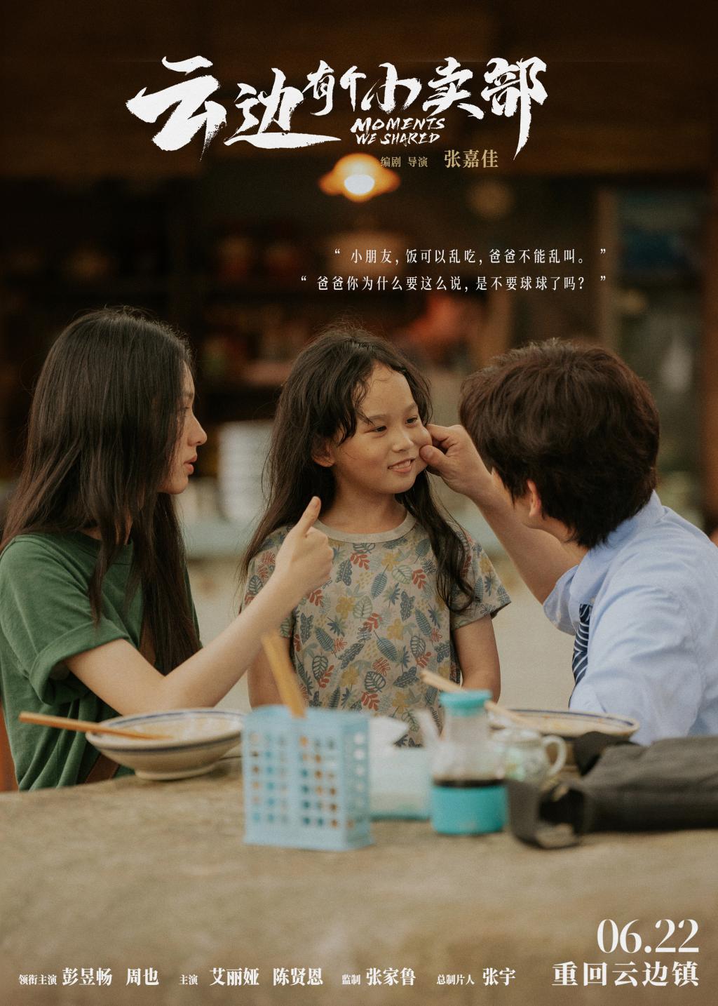 由原著作者张嘉佳编剧并导演的电影《云边有个小卖部》将于 6 月 22 日全国公映,今日发布 " 面馆跳出来的女儿 " 预告与一组海报。刘十三(彭昱畅 饰)回到云边镇,除了外婆王莺莺(艾丽娅 饰)和童年好友程霜(周也 饰),他还遇到了人小鬼大、聪明懂事的小女孩球球(陈贤恩 饰)。一场 " 意外 " 的邂逅,让刘十三与程霜 " 喜当爸妈 ",他们与球球临时组成了 " 三口之家 ",开启了一段 " 幸福就在眼前,却又意外溜走 " 的时光。原著名场面在电影中以影像的方式逐步解锁,重温球球 " 认亲 " 这一幕,竟是如此的欢乐与温馨。