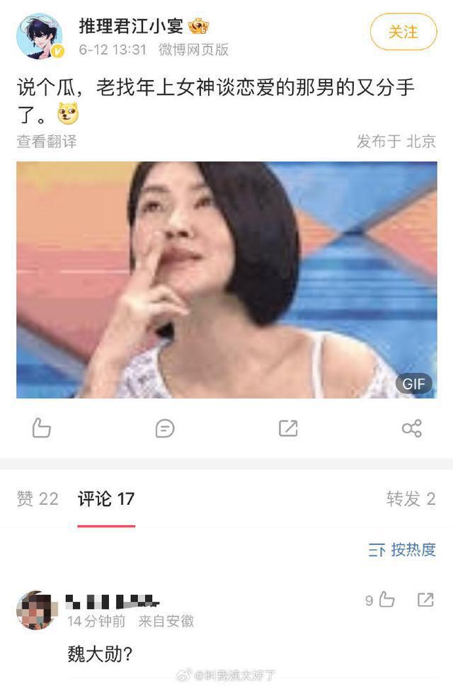 狗仔爆料:「说个瓜,老找年上女神谈恋爱的那男的又分手了。」(图/翻摄自微博)