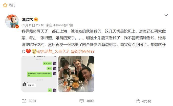 9月中旬的时候,张歆艺还晒出了自己和刘恋、朱洁静等人一起聚餐的画面↓