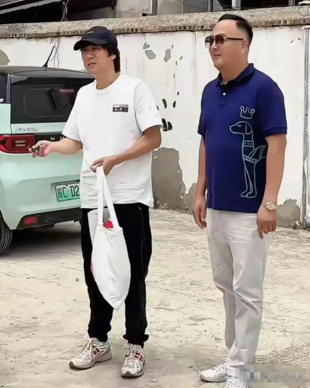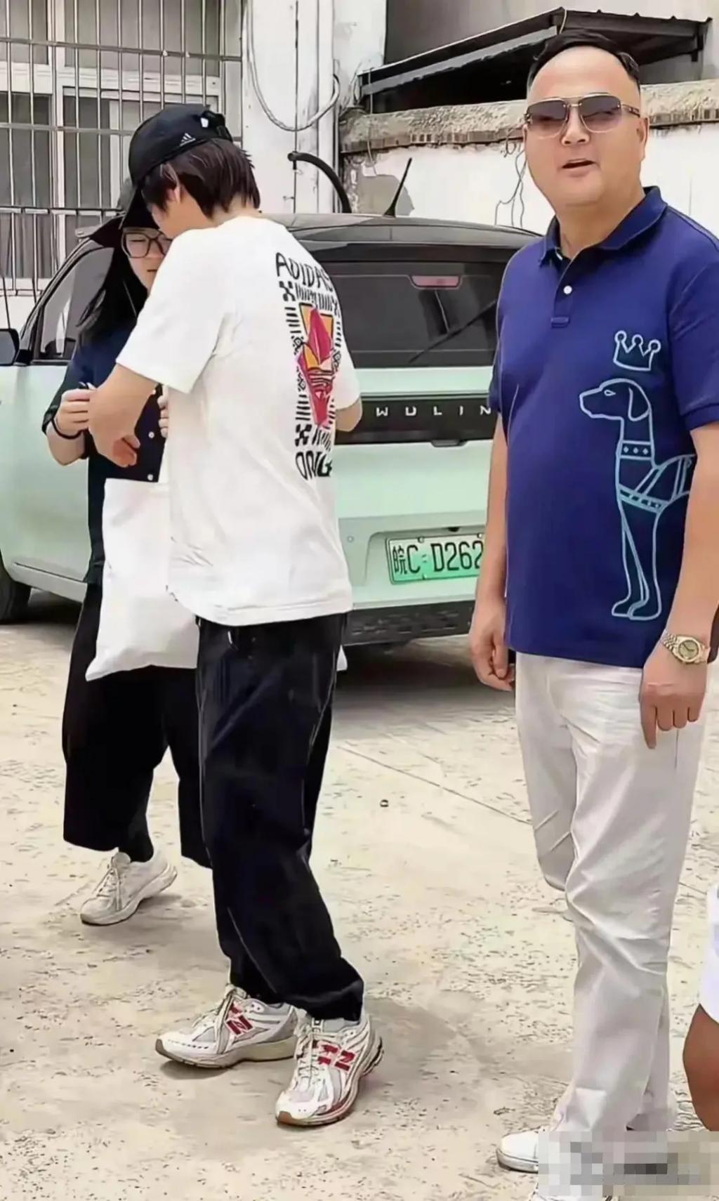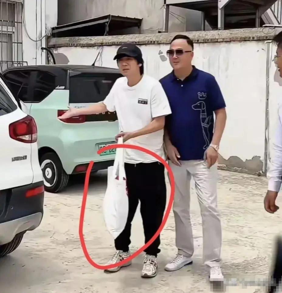 他不仅打扮风格休闲随意,连发型也看着十分的潦草不堪,手上提着的廉价布袋分外抢眼,站姿弯腰弓背的样子,和旁边精致的 " 墨镜老板 " 对比,可以说是天壤之别的邋遢至极。