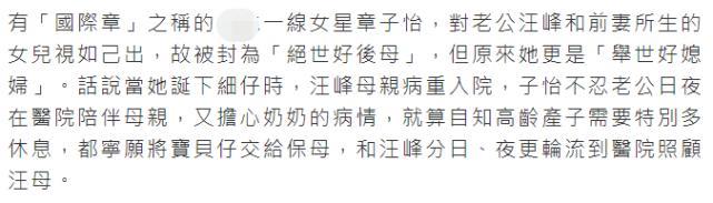 章子怡因为对汪峰与前任葛荟婕所生的女儿熙熙视如己出,被称为绝世好后妈,还在高龄生下二胎后到医院照顾婆婆,堪称举世好媳妇。