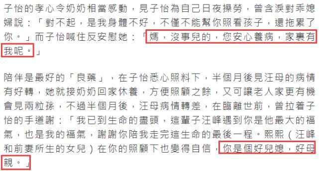 汪峰的妈妈见到儿媳为自己日夜操劳,曾含泪对儿媳章子怡说:“对不起,是我身体不好,不仅不能帮你照看孩子,还拖累了你”,而章子怡喊住婆婆并安慰她:“妈,没事儿的,您安心养病,家里有我呢”。