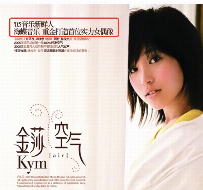 2005年,金莎的首张专辑《空气》“横空问世”,并且凭借这张专辑成为了某风云榜最佳新人,斩获多个奖项。