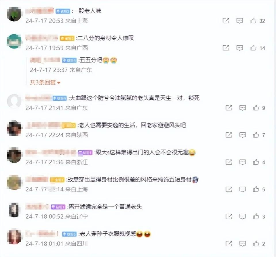 对此,有网友表示:" 一股老人味 ,大 S 是真的饿了!",还有人认为:" 老人也需要安逸的生活,回老家避避风头吧。离开滤镜完全是一个普通老头 "