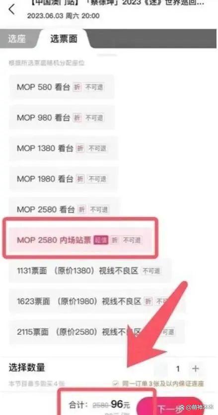 不仅如此,蔡徐坤演唱会开场前,门票依然没有售罄,售票网站直接将原价 2580 元的内场官方门票以 96 元的价格出售。这都已经不能算作打折,而是亏本清算了!最尴尬的是,即便是这么低的价格,还是没有多少人买。