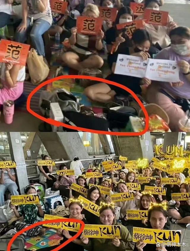 蔡徐坤这边甚至还有一部分黑衣粉丝,屁股下面坐着的垫子都和之前给范丞丞接机的粉丝坐着的垫子一模一样,很明显就是同一批人。