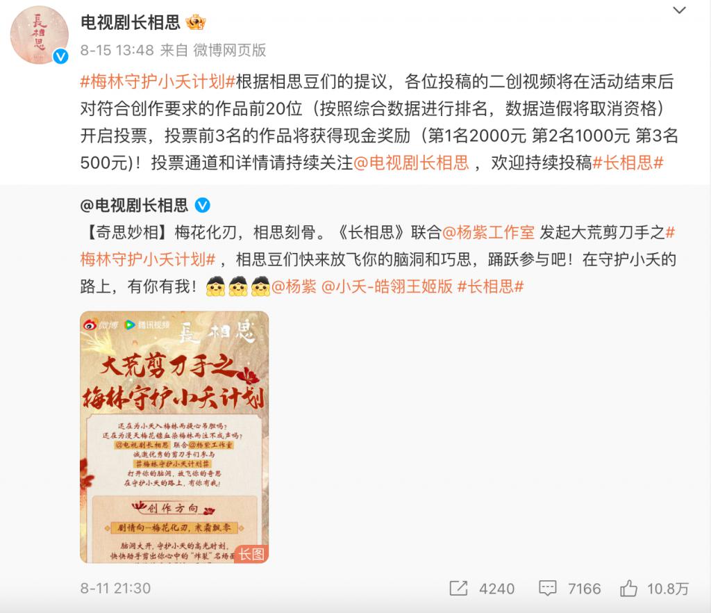 好在《长相思》够火,也能够吸引足够多优秀的剪刀手们入局。大结局点映后的第二天,《长相思》官方顺应用户提议,将对参与二创活动的视频进行投票评选,前三名分别获得 2000 元、1000 元、500 元的现金奖励。至此,这场看起来更像是一场以二创为名的剧集营销活动告一段落。