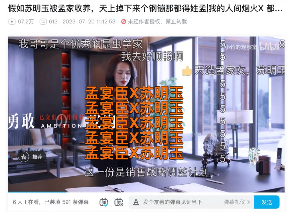 另一种重组剧情式二创则流行于 " 意难平 " 类剧集,尤其是与观众预想背道而驰的剧集,比如《我的人间烟火》。由于剧中男女主角人设观众难以理解,在 B 站上便涌现了大量观众自行选角重塑剧情的二创内容,比如以《都挺好》中的苏明玉、《狂飙》中的高启兰替代原剧中的许沁,打造观众心中的 " 孟式家族 "。
