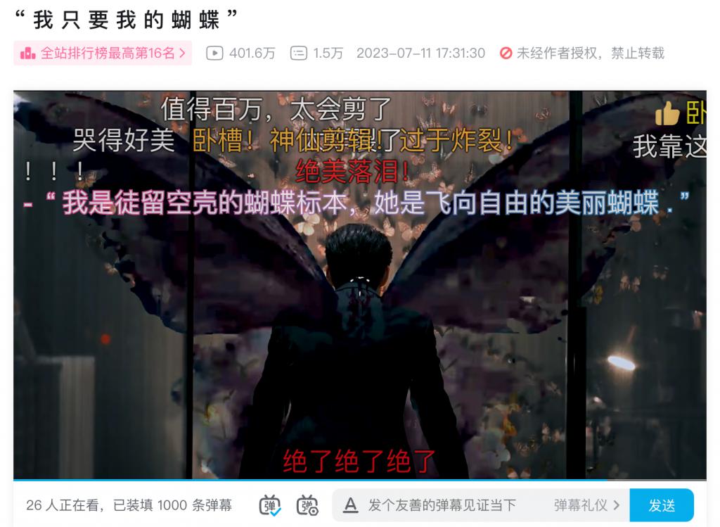 首先是单人角色剪辑,这是目前最主流的二创内容。通常用户会围绕热播剧集的某一角色,进行二次创作。比如此前在 B 站创造多条百万播放东方青苍角色剪辑,以及最新的例子——孟宴臣的角色剪辑。