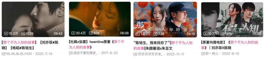 比如大热 IP《那个不为人知的故事》在 B 站已有杜鹃 / 张震、刘亦菲 / 陈晓,以及朱颜曼滋 / 朱亚文等多部拉郎剪辑,这在某种程度上甚至会影响后续 IP 影视化的选角。