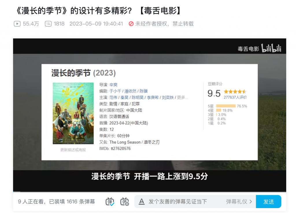 剧集播出后,用户会根据剧情槽点自发录制视频,或进行恶搞,传播量通常较大;内容质量较好的剧集观众则会围绕其进行解说、拉片。比如《狂飙》《漫长的季节》播出后,大量网友从故事文本、镜头语言、配乐系统对其进行详细解读,至今仍吸引大量用户观看、互动。