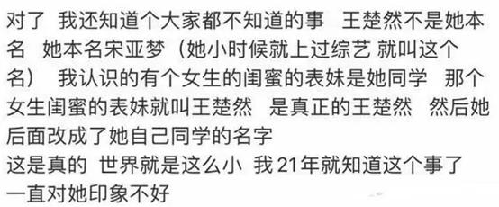 首先,曝出她本名叫宋亚梦,王楚然这个名字是她同学的,家人离婚后她改成了这个名字。