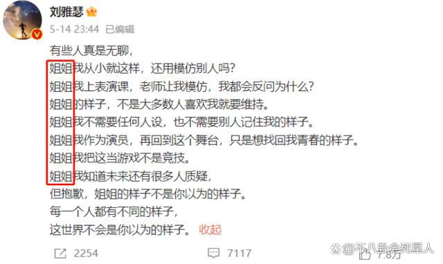 前面还嘴硬的刘雅瑟,在听到别人说自己是在 " 模仿 " 李斯丹妮后,忍不下去了,专门发了篇小作文怒怼黑粉,一篇小作文 " 含姐量 " 极高,轰轰烈烈地掀开和黑粉的 battle,不过她越是回应,黑粉就越是逮着她嘲。