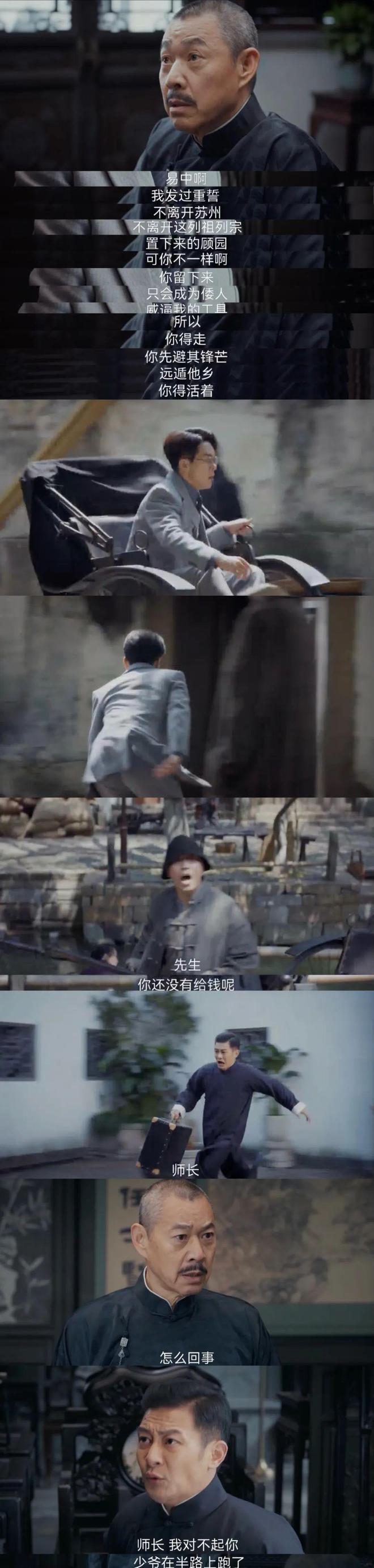 顾希形(张丰毅 饰)认为儿子顾易中被诬陷,是一场阴谋。为了不让儿子成为把柄,他决定安排儿子顾易中离开苏州避风头。然而顾易中不想背负 " 叛徒 " 的罪名,为了找到能证明他清白的人证,他背着父亲逃离了顾园。