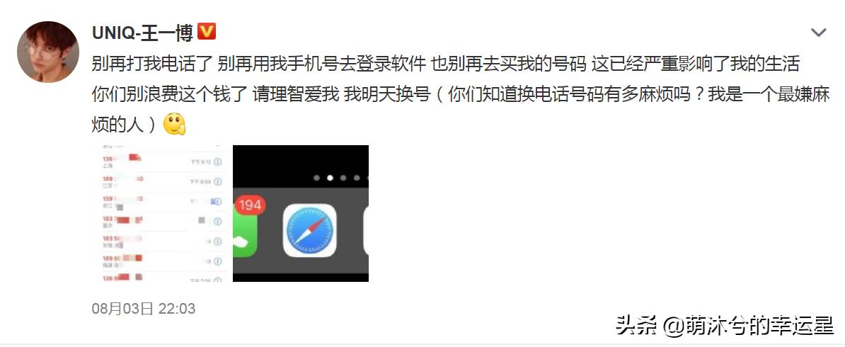 最近遭受私生烦恼的就是王一博了,昨天王一博第一次因为被私生饭骚扰发了微博,斥责了自己电话号码被泄露,一直打电话骚扰他,一会时间就有一百多个未接来电,并且还尝试用他的手机号登录各种的软件,导致王一博忍无可忍最后说会换手机号。