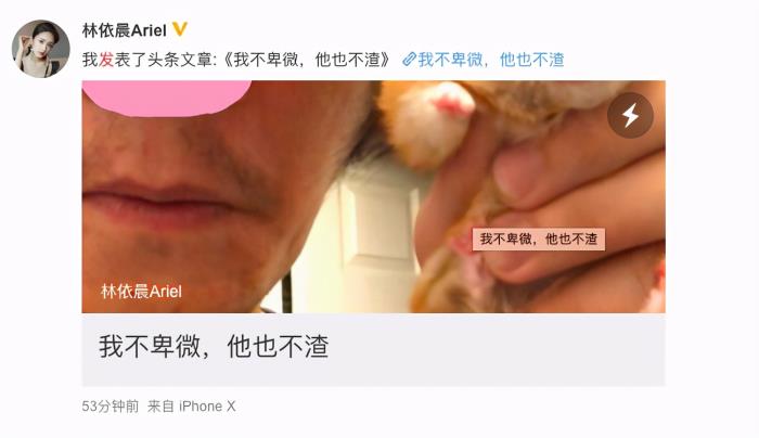 4月9日,林依晨在微博发长文回应“豪门卑微”:我不卑微,他也不渣。