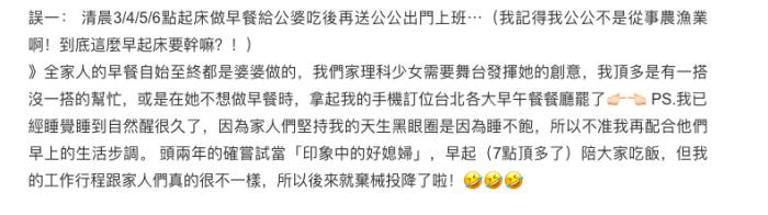 林依晨说全家人的早餐自始至终都是婆婆做的,而她只是有时候搭把手。另外她现在是睡觉自然醒,家人们也坚持让她按照自己的步调来,不用来配合他们早上的生活步调。林依晨曾经尝试过早起陪大家吃早餐,但是现在早已经缴械投降,因为她的工作行程跟家人们很不一样。
