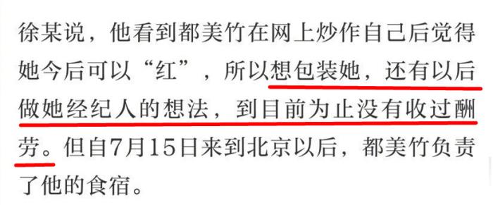 徐某表示自己看中的是长远利益,想做都美竹的经纪人。