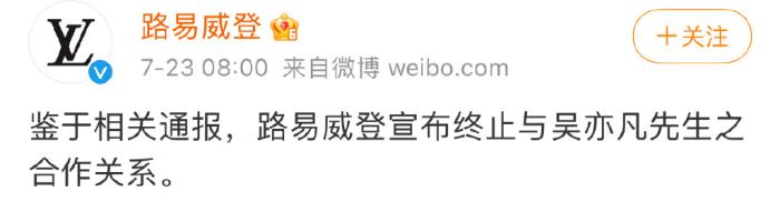路易威登宣布终止与吴亦凡的合作关系。
