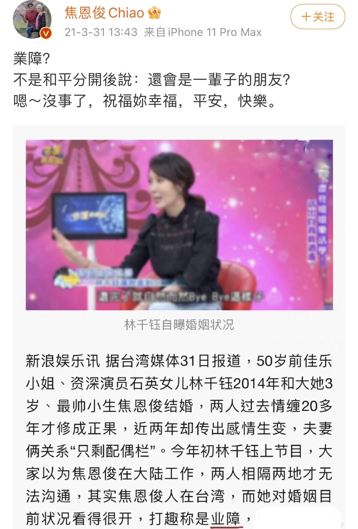 但在2021年,焦恩俊突然在微博公布了自己已经离婚的消息。