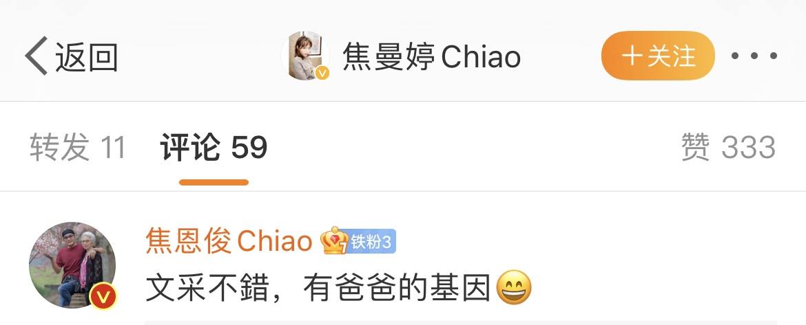 女儿发的动态,焦恩俊总会送上正面的评论来鼓励女儿。