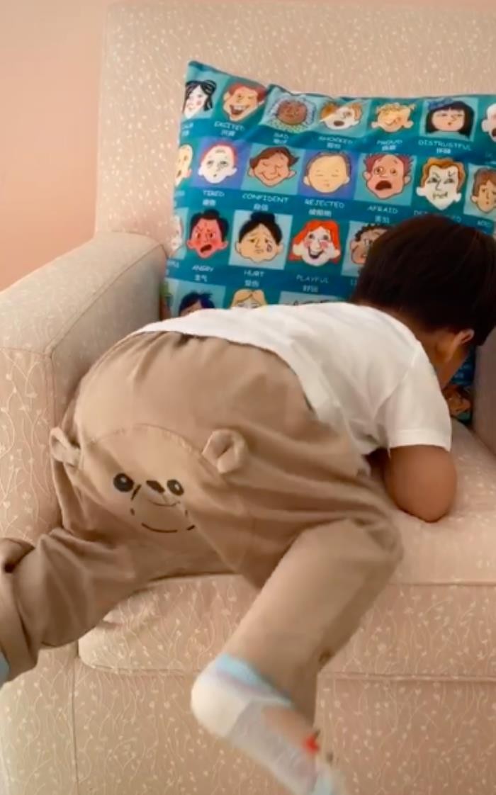 虽然小儿子才只有17个月大,但整个人已经长高了不少,一双小胳膊肉乎乎的,头发乌黑浓密,十分可爱。只见他使出吃奶的力气,一个劲往小沙发上爬。