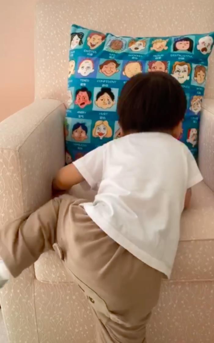 看着儿子爬不上去,章子怡一开始忍不住想帮忙用手去推他上沙发,最后小儿子还是凭借自己的努力终于爬了上去。
