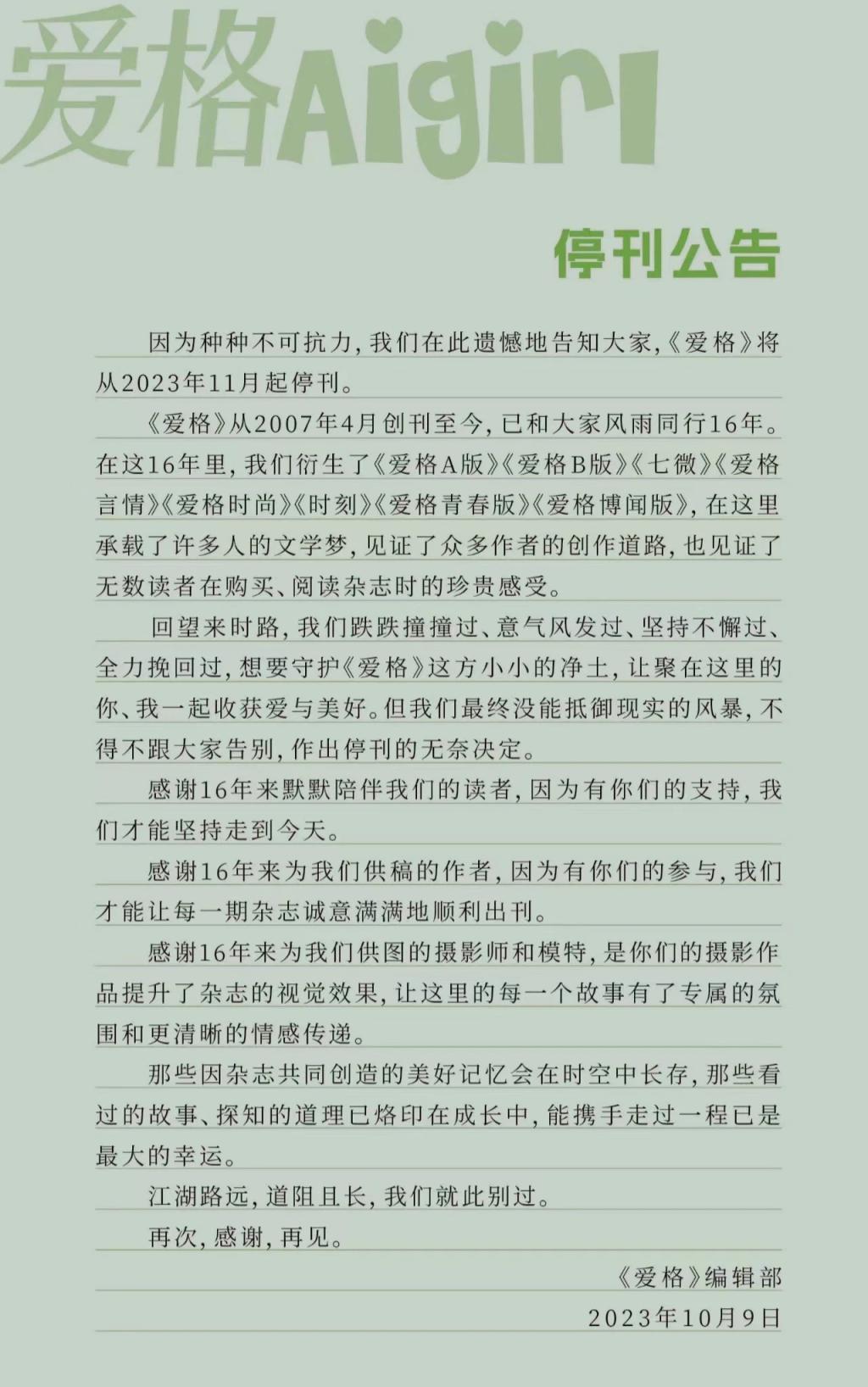 10 月 9 日,青春杂志巨头《爱格》宣布从 2023 年 11 月起因种种不可抗力停刊。消息一出,网上就炸开了锅。