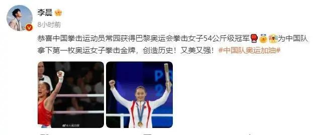 8 月 9 日,李晨在社交平台上恭喜中国拳击运动员常园夺金。他发文称:" 恭喜中国拳击运动员常园获得巴黎奥运会拳击女子 54 公斤级冠军,为中国队拿下第一枚奥运女子拳击金牌,创造历史!又美又强!中国队奥运加油。"