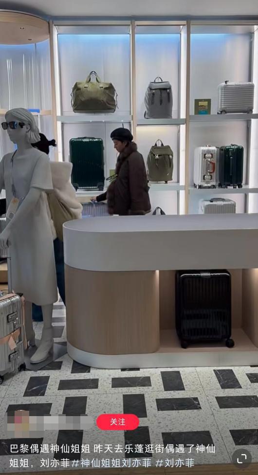 这位网友称在巴黎乐蓬逛街的时候偶遇了刘亦菲。视频中,刘亦菲正在购买行李箱,她推着一个银色的行李箱来回拉送,在观察行李箱的质量如何。