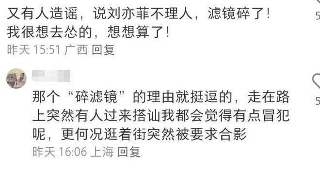 可惜的是,刘亦菲低调出行也引来不小的争议,其中一位偶遇者称刘亦菲冷脸拒绝合影,斥责其 " 耍大牌 ",并感慨对刘亦菲的 " 滤镜碎了 "。
