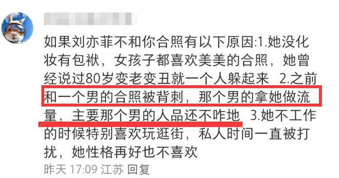 粉丝表示刘亦菲此前被一位合影者背刺过,那人用刘亦菲做流量搞直播,结果被扒出是骗钱的渣男。自那以后,刘亦菲便很少和别人合照。但粉丝表示刘亦菲或许会拒绝合照,但一定不会不理人。