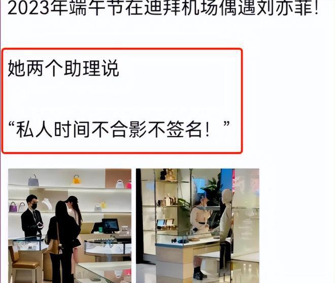 2025 年端午节,有网友在迪拜机场偶遇了刘亦菲,刘亦菲的两位助理便表示 " 私人时间不合影不签名 ",此举也让刘亦菲被冠上耍大牌的嫌疑。