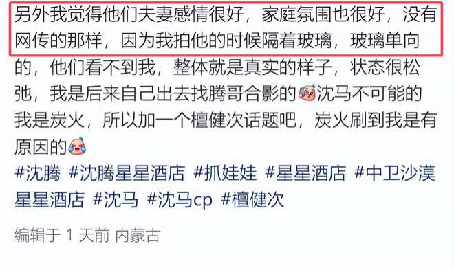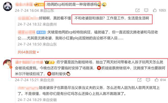 不少理智的粉丝也开始发声,认为工作和生活应该分开。磕 CP 不能混入现实生活,更不应该诋毁沈腾的妻子和马丽的老公。沈腾的粉丝也发声,透露沈腾现身宁夏是因为剧组转场,便抽了两天时间带着老人孩子玩两天,结果却被说成度假。而且 24 日当晚还在宁夏临时安排了路演,结果却被说成了 " 摆烂 "!