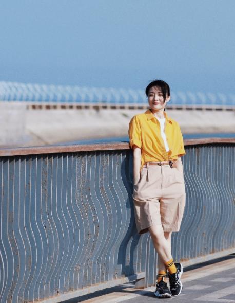 在照片中,可以看到周涛站在青岛的某座大桥上,身穿黄色衬衫外套,内搭白色短袖,下身搭配卡其色休闲短裤,脚踩有黑色运动鞋,整个人看起来非常的青春靓丽,而且填的脸上未经过过多的修饰,头发绑在脑后,彰显着一种酷飒之感,非常的帅气,而且她一手扶着护栏,扭头望向远方,能看见精致的侧颜,给人一种女军人英姿飒爽的感觉,真的太应景了。