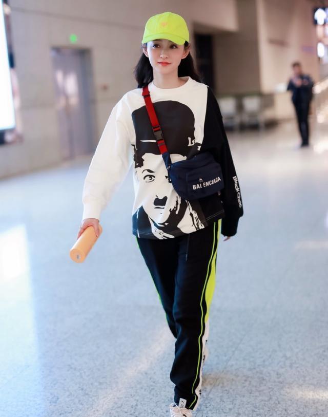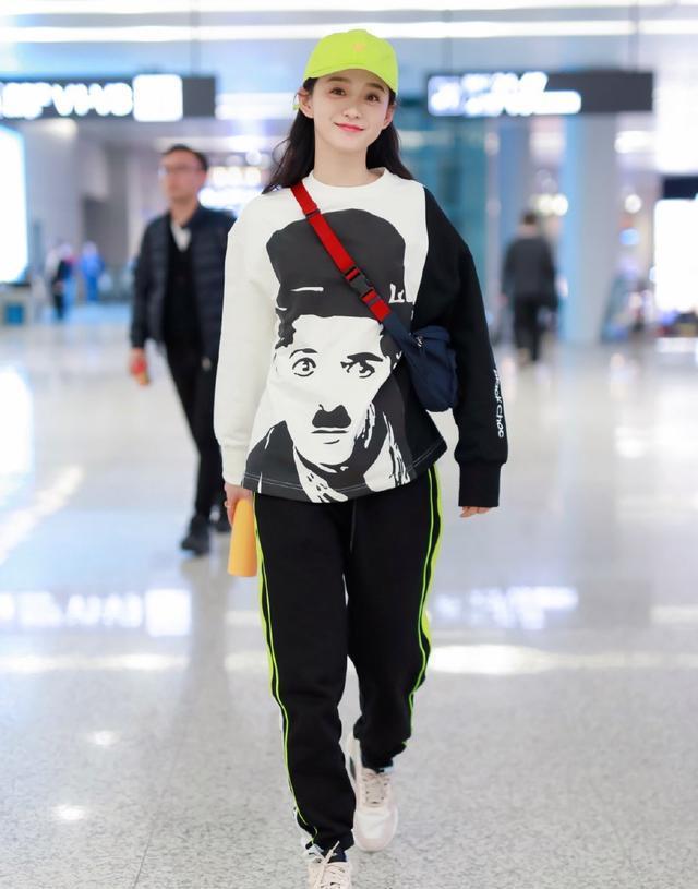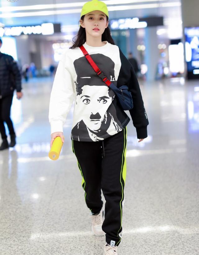何泓姗上身穿着印有卓别林头像卫衣,经典的黑白色调搭配,充满着复古怀旧的气息。卫衣有一侧是拼接的黑色袖子,看上去时尚还很有设计感。