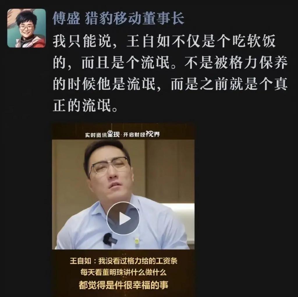 也可能因为如此,金星才发文内涵,而且不止金星,还有猎豹移动董事长傅盛也发文内涵王自如,说他就是个吃软饭的。
