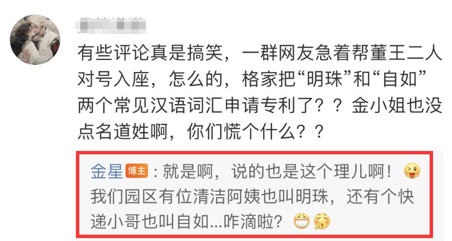 引发网友热议后,金星更回复了有关董明珠王自如的评论,这位网友说金星也没点名道姓,一群网友急着帮董王二人对号入座,怎么的,格家把 " 明珠 " 和 " 自如 " 两个常见汉语词汇申请专利了?
