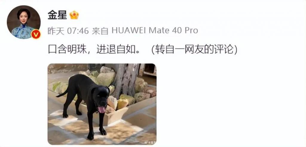 金星还在个人账号上晒了一张黑狗的照片,这只黑狗站在大树下,眼睛看向前方,嘴里的舌头伸出来,不知道是热得不行,还是在摇尾乞怜要吃的。
